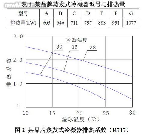 例如,已知制冷劑為 R717、冷凝溫度35℃、濕球溫度25℃、排熱量586kW,依據(jù)表1、圖2 選擇冷凝器型號。