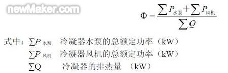 筆者在對典型產(chǎn)品的技術(shù)參數(shù)比較分析發(fā)現(xiàn),不同的蒸發(fā)式冷凝器,其單位排熱量能耗有明顯的差異。顯然,蒸發(fā)式冷凝器的能耗由水泵和風(fēng)機(jī)組成。產(chǎn)品的技術(shù)手冊上均有水泵、風(fēng)機(jī)的額定功率以及冷凝器的排熱量,據(jù)此可以歸納出一個單位排熱量的耗功Φ 的計算公式。