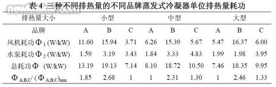 由公式(3)可得,不同排熱量的三種品牌蒸發(fā)式冷凝器單位排熱量風(fēng)機(jī)、水泵以及冷凝器系統(tǒng)總耗功統(tǒng)計如表4。