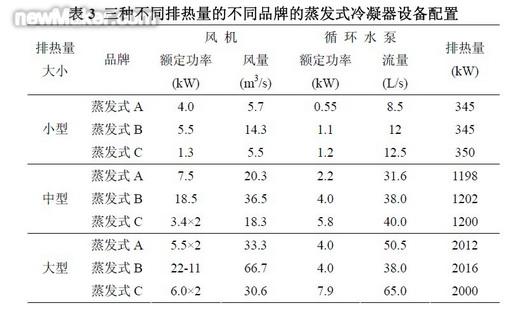 目前國內(nèi)典型的蒸發(fā)式冷凝器產(chǎn)品主要有中美合資的上海益美高 ATC 系列、中美合資的大連冰山巴爾的摩CXV 系列、國內(nèi)煙臺冰輪的ZNX 系列和上海寶豐的SPL 型等。用戶在選用不同品牌的蒸發(fā)式冷凝器時,不僅要明確產(chǎn)品設(shè)計依據(jù)的標(biāo)準(zhǔn),而且還要進(jìn)行詳細(xì)的能耗核算。以下選用上述廠家中三種典型品牌的蒸發(fā)式冷凝器A、B、C,利用公式(3)進(jìn)行能耗核算。依據(jù)各自的技術(shù)手冊,可知三種不同排熱量的不同品牌蒸發(fā)式冷凝器的設(shè)備配置,如表3 所示。