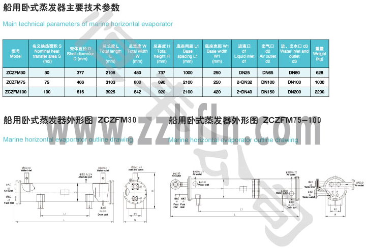 船用臥式蒸發(fā)器的主要作用是通過(guò)氟利昂(R22)液體節(jié)流后進(jìn)入蒸發(fā)器殼體內(nèi)蒸發(fā),吸收管內(nèi)載冷劑(海水)熱量,制取冷海水。