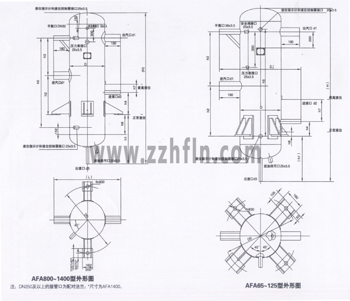 AFA系列氨液分離器為立式結(jié)構(gòu),從蒸發(fā)器來得氨氣從設(shè)備中部的進氣管進入,分離液滿后從設(shè)備上部的出氣管被壓縮機吸走。