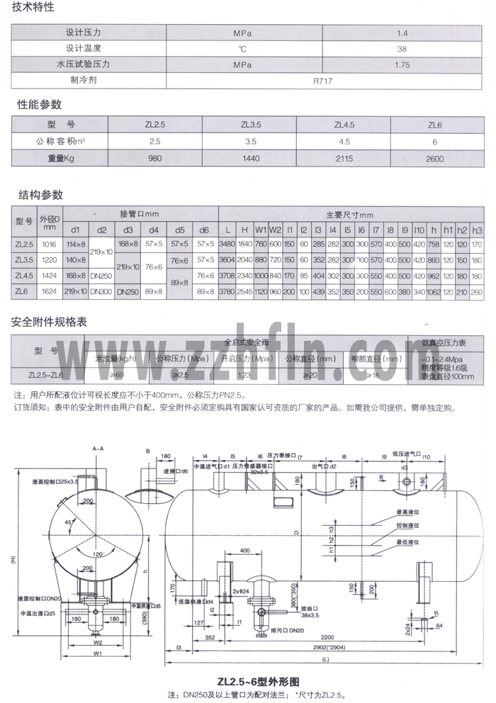 ZL系列中間冷卻器用于二級節(jié)流中間完全冷卻系統(tǒng)。高壓貯液器來的液體,經(jīng)過節(jié)流后從低壓級排汽口進入中間冷卻器;從低壓級壓縮機來的氨氣進入中間冷卻器液面以下洗滌降溫后,同中溫蒸發(fā)器回來的進行氣液分離后的氨氣一同被高壓級壓縮機吸走。同時一部分液體從下面油包處中溫出液口被氨泵送往中溫蒸發(fā)器,另一部分液體經(jīng)再次節(jié)流后,供低溫蒸發(fā)器使用。
