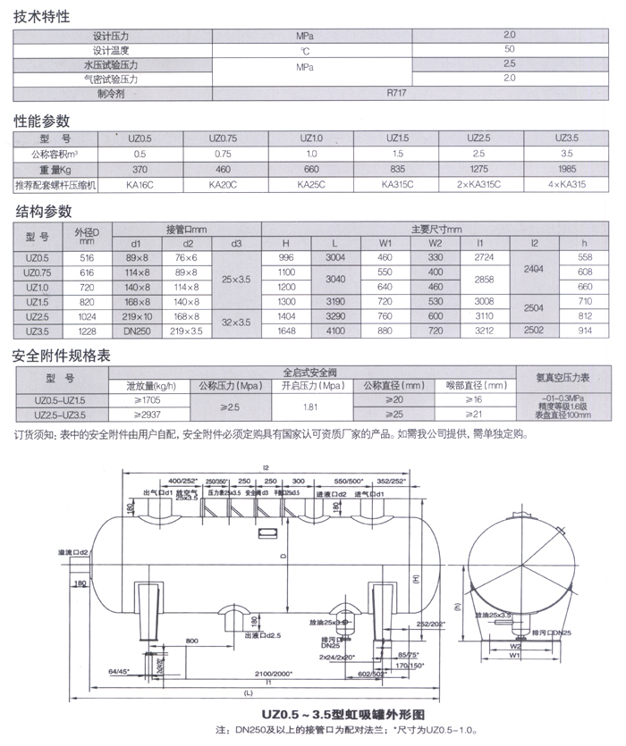 UZ系列虹吸罐主要用于液冷油冷螺桿壓縮機制冷系統(tǒng),用以保證冷凝器冷凝后的液體優(yōu)先供給油冷卻器。